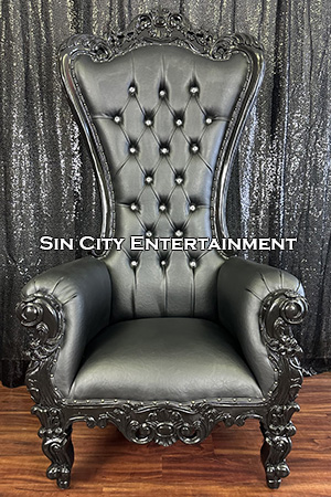 Black throne chair rental in Las Vegas and the surrounding area. Your private event can't go wrong with this black beauty throne chair. It's perfect for Halloween parties, pirate fests, gangster themes, music videos, photoshoots, and other fun ideas. For the best throne chair rentals, fill out our contact form or give us a call to speak with an event planner.